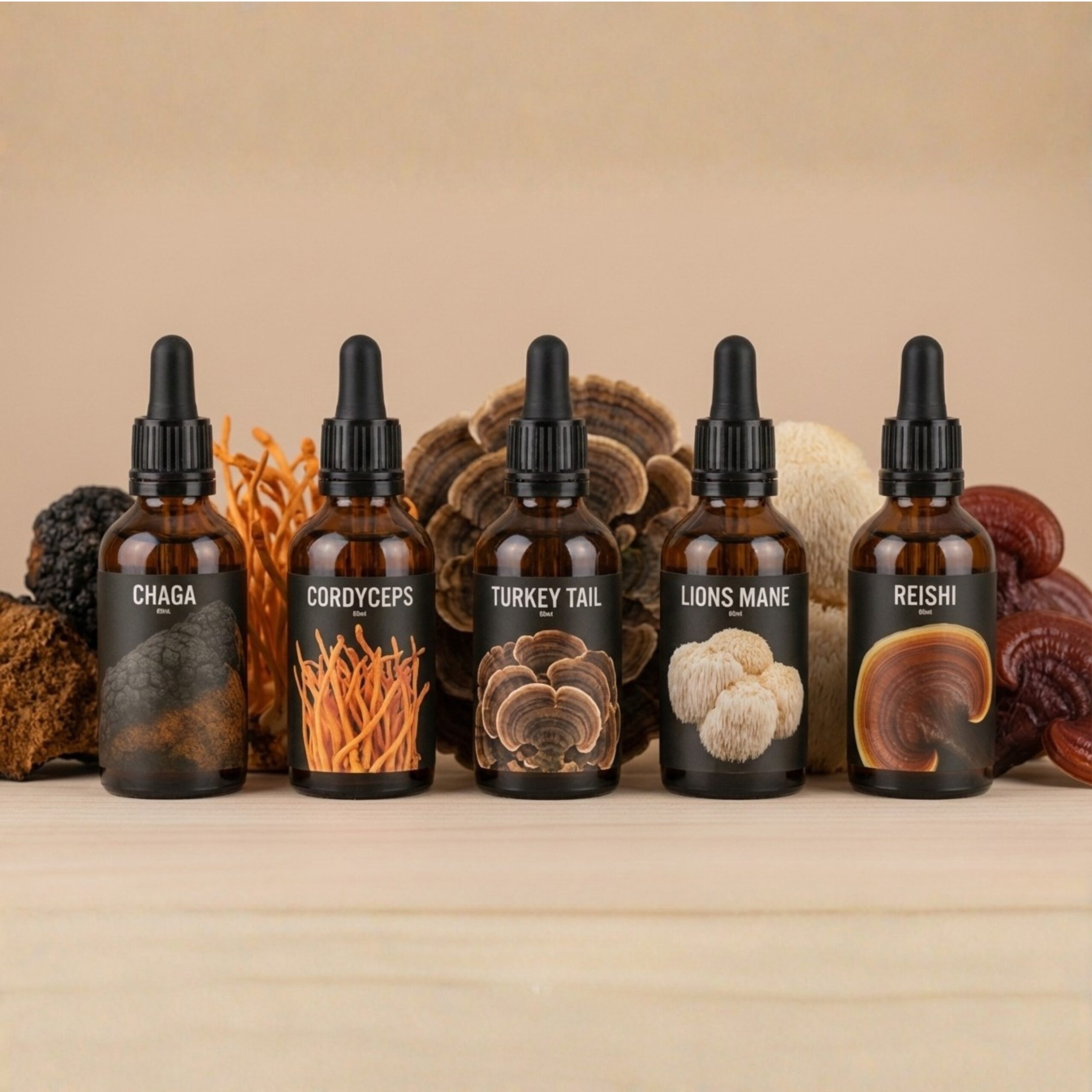 Explore the full spectrum of functional mushrooms with our complete set of dual-extracted tinctures: Lion’s Mane, Reishi, Cordyceps, Turkey Tail, and Chaga. Each targets a unique aspect of well-being — from mental clarity and stress resilience to immune support and cellular protection.